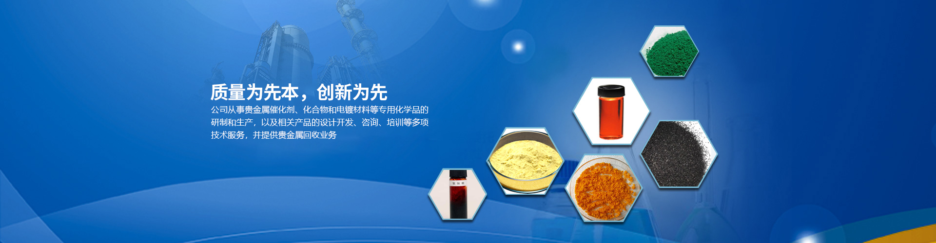 目前公司的主要產(chǎn)品有:醋酸鈀、氯化鈀、硝酸鈀、硫酸鈀、氯鉑酸、反-二(三苯基膦)二氯化鈀、四(三苯基膦)鈀、乙酰丙酮鈀;三氯化銠、辛酸銠、碘化銠、硝酸銠、醋酸銠、三苯基膦氯化銠、三苯基膦乙酰丙酮羰基銠、三苯基膦氯化銠、乙酰丙酮二羰基銠等,廣泛應用于藥物合成、石油化工、精細化工和電鍍領域。本公司對所有產(chǎn)品進行嚴格檢測從定量和定性方面嚴把質(zhì)量關(guān),并通過ISO90001質(zhì)量體系認證。